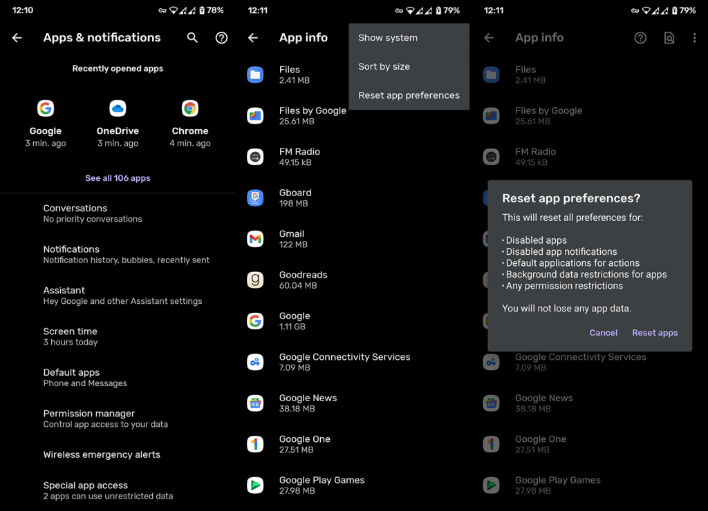 - Toque el menú de 3 puntos y seleccione Restablecer preferencias de la aplicación .