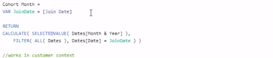 Si piensa en la cohorte en sí misma, significa "agrupación de clientes". Así que aquí calculamos cuándo se unió el cliente o cuándo nos compró por primera vez. Esto es lo que estamos clasificando como la fecha de ingreso .