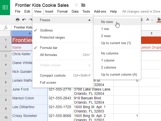 Para descongelar filas, haga clic en Ver , coloque el cursor sobre Congelar y luego seleccione Sin filas . Para descongelar columnas, haga clic en Ver , coloque el cursor sobre Congelar y luego seleccione Sin columnas .
