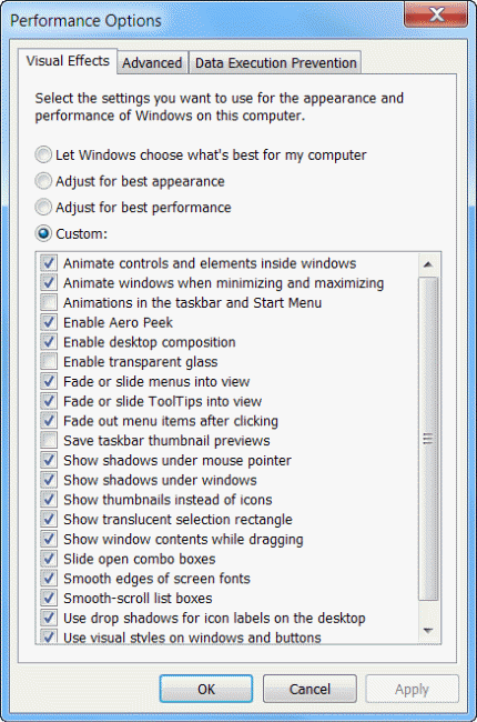 You can choose to disable the visual effects like taskbar animation, animate the Windows while minimizing & maximizing, transparent glass, fade-out menu items after clicking and slide open combo box and others.