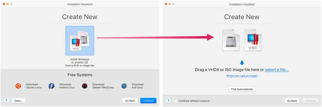 Windows インストール イメージを [インストール イメージの選択] ウィンドウにドラッグするか、[自動検索] をクリックします。あなたがしたら: