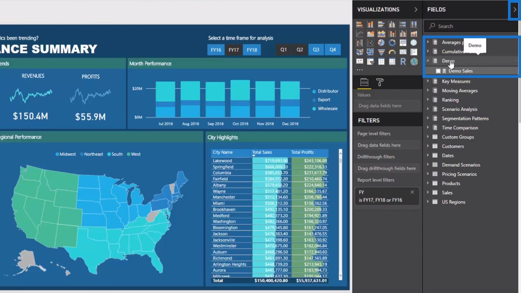 ここでもう一つ素晴らしいものを紹介したいと思います。ビジュアライゼーション(この場合は都市のハイライト)を選択すると、含まれているメジャーがメジャー グループまたはテーブル内のどこに表示されるかを常に確認できます。