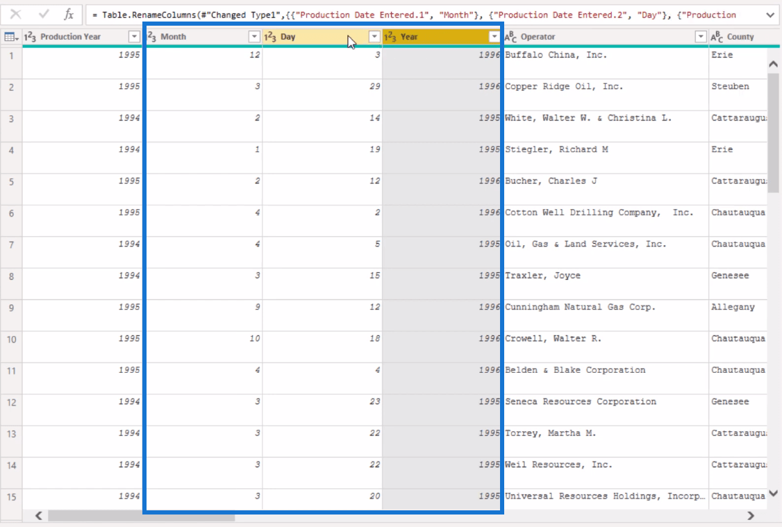 列が分割されたら、各列の名前を変更します。3 つの列にそれぞれ、月、日、年という名前を付けます。