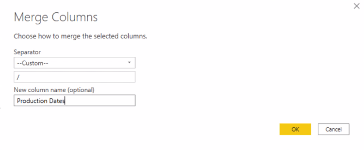 次に、カスタム区切り文字を選択できます。この例では、前と同様にスラッシュを使用し続け、列名を Production Dates に変更します。