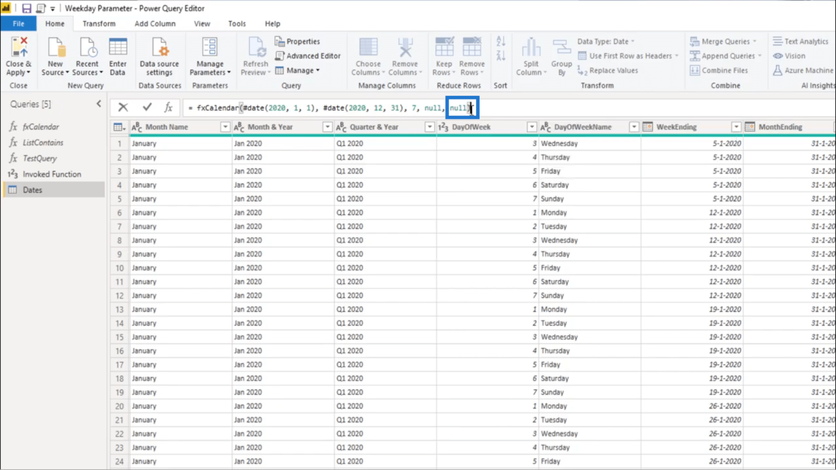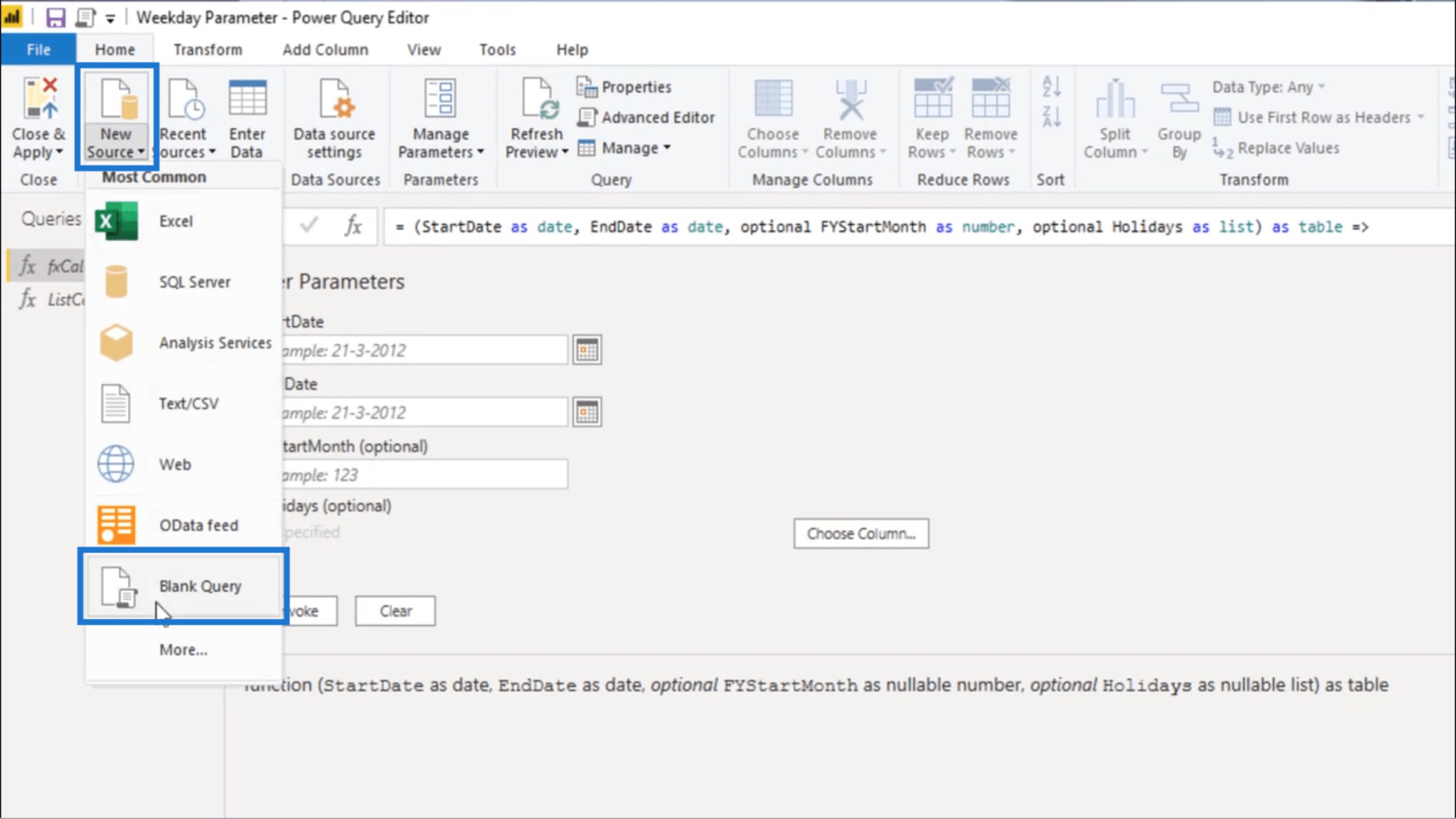 これは、日付テーブル クエリの M 関数に直接追加パラメーターを追加する方法です。先ほども述べたように、プロセスはまったく複雑ではありません。M コードのソースがあれば、そこからは簡単です。