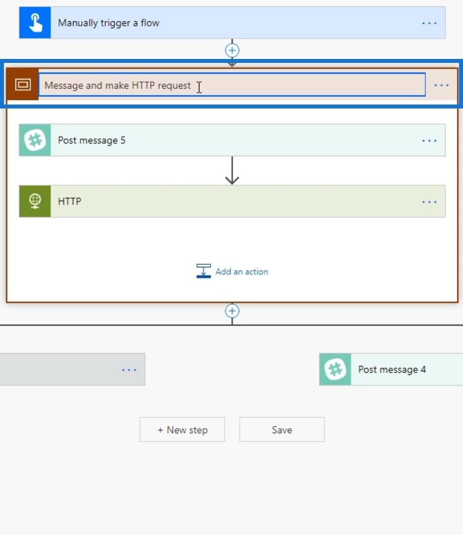 その後、グループに含めるアクションをドラッグ アンド ドロップします。この例では、Post message 5とHTTPアクションの両方をドラッグしてみましょう。