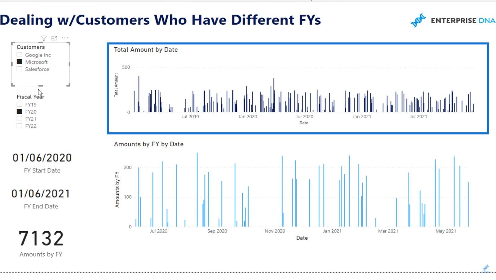 一方、日付別会計年度別金額には、スライサーからの選択に基づいて結果が表示されます。この例では、 Microsoftの2020 会計年度 ( FY20 )のみが表示されます。