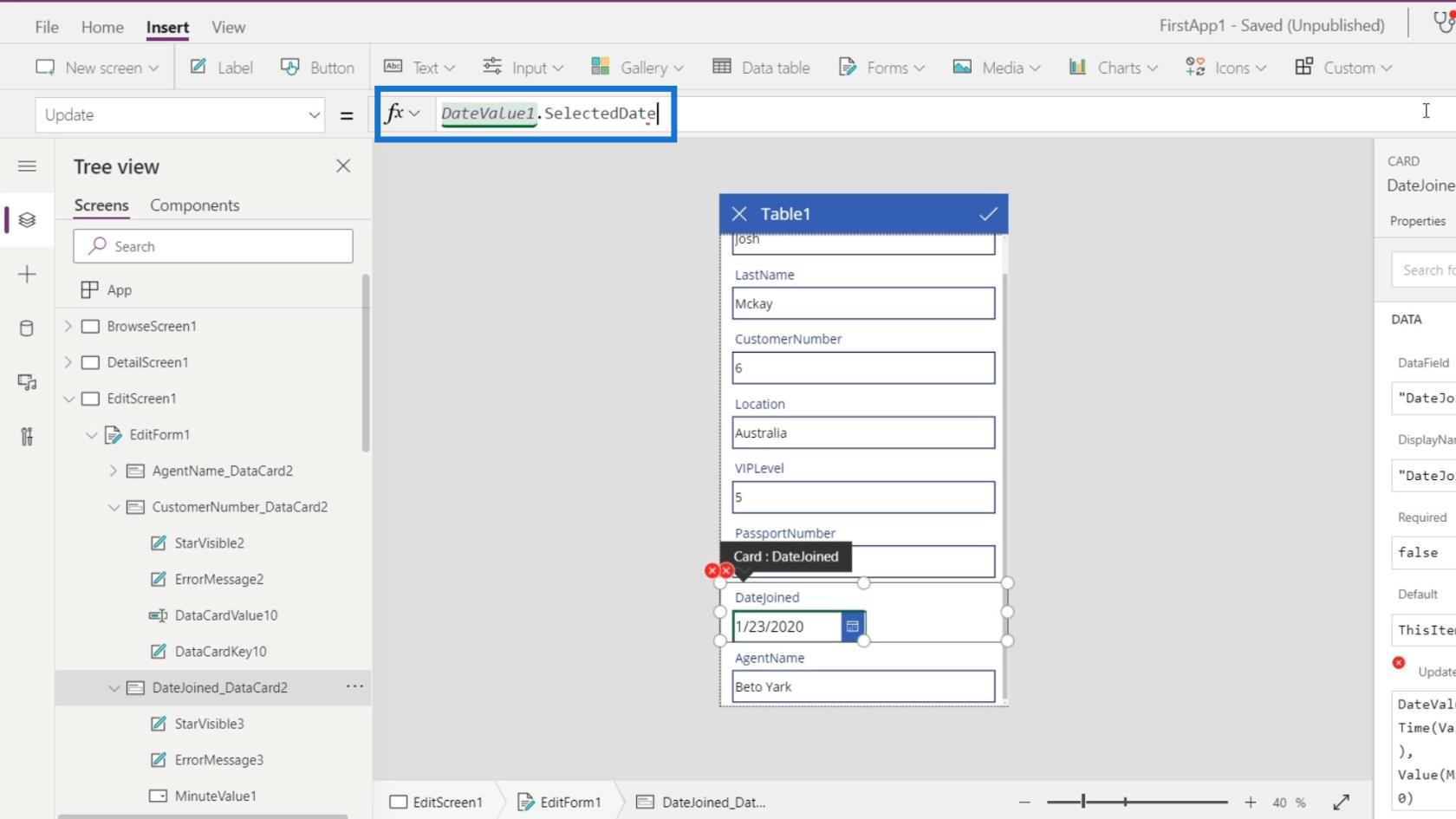 このデータ カードのUpdateプロパティには、 DateJoinedデータ カードである DateValue1.SelectDate と、HourValue1とMinuteValue1 (作成したデータ カード)を含むTime関数とValue関数が含まれているため、エラーがあることがわかります。以前に削除されました)。このエラーが発生する理由は、これら 2 つの要素を削除したにもかかわらず、更新式がまだこれを参照しているためです。