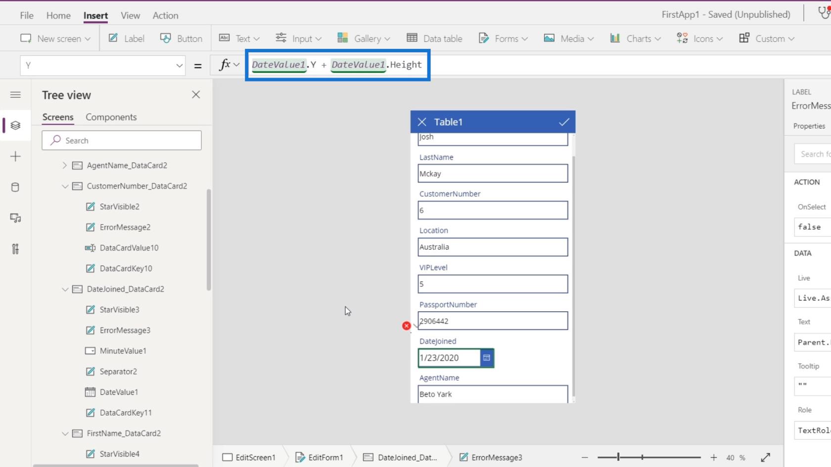 次のエラーはErrorMessage3要素内にあります。これには、その要素の垂直位置に関するプロパティYがあります。ここでは、削除したHourValue1のY位置と高さを参照しています。