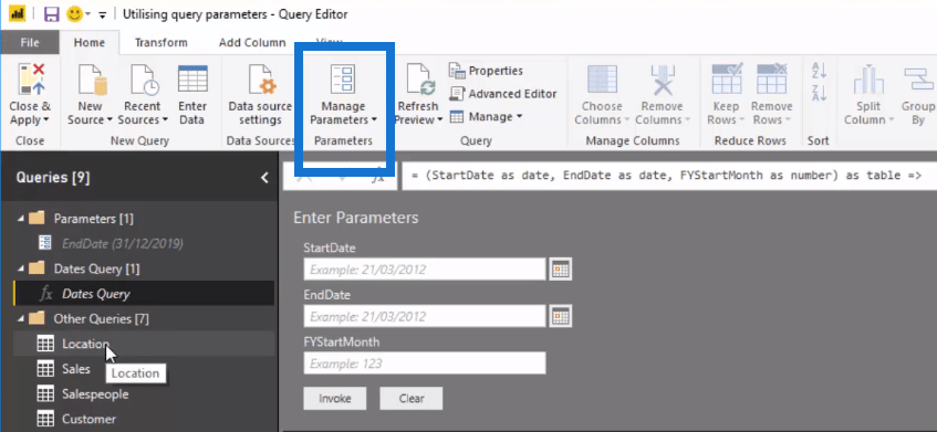 クエリ エディター内で、この素晴らしい機能であるパラメーターの管理を使用してパラメーターを入力します。