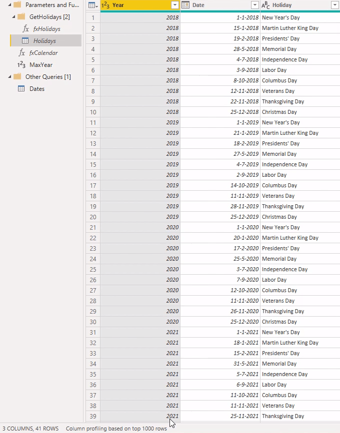 休日テーブルを確認すると、最大年が 2021 年であっても、2018 年から 2020 年まで続くことがわかります。