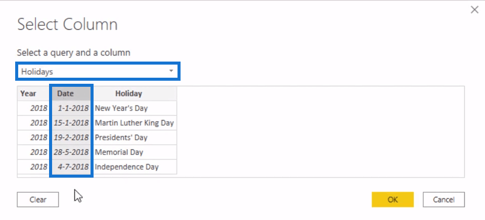 祝日と日付を含む列を選択し、「OK」をクリックします。
