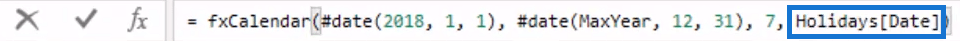 すべてを設定して「呼び出し」をクリックすると、数式バーに「Holidays[Date]」変数が表示されます。その変数をコピーし、呼び出された関数を削除します。
