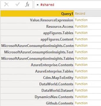 グローバル環境を表示するには、組み込み変数#sharedを使用します。現在のファイル内のすべてのクエリ、テーブル、定数、レコード、リスト、およびネイティブおよびカスタムM関数のすべての名前と値を含むレコードを返します。