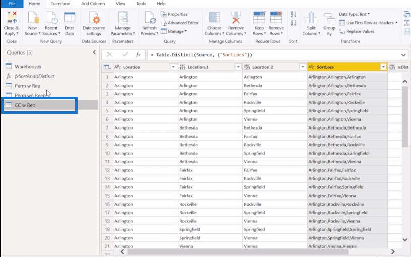 置換による置換 (Perm w Rep) テーブルを再度取得し、同じパターン (呼び出し) を実行して、これを締めくくりましょう。次に、重複(SortLocs 列) を削除します。これは組み合わせであり、順序は重要ではないためです。これは置換なしなので、個別の list のみが必要です。したがって、IsDistinct 列の FALSE をクリックしてオフにします。