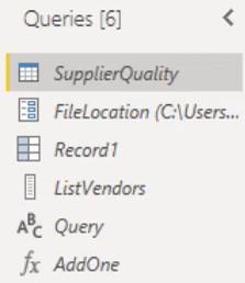 数式バーの左側には、[クエリ] ウィンドウがあります。これには、現在のファイル内のすべてのクエリのリストが含まれます。クエリ名の横にあるアイコンはそのタイプを示します。