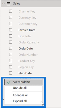[フィールド] ペインを右クリックし、 [非表示に表示] のチェックを外すと、非表示の列を非表示にすることができます。