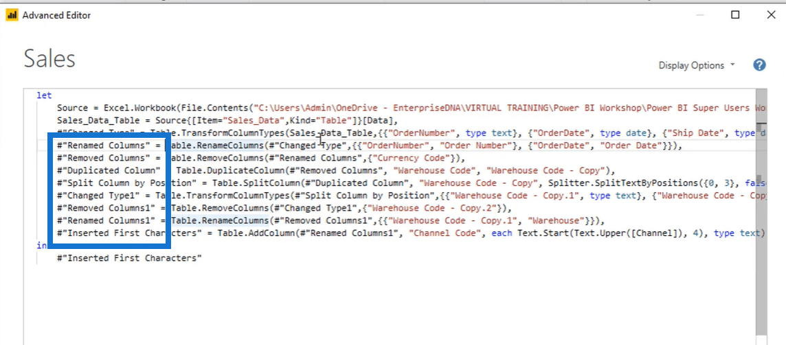 M コード内で最初に確認できるのはソースです。この部分では、システムがデータを取得した場所が表示されます。
