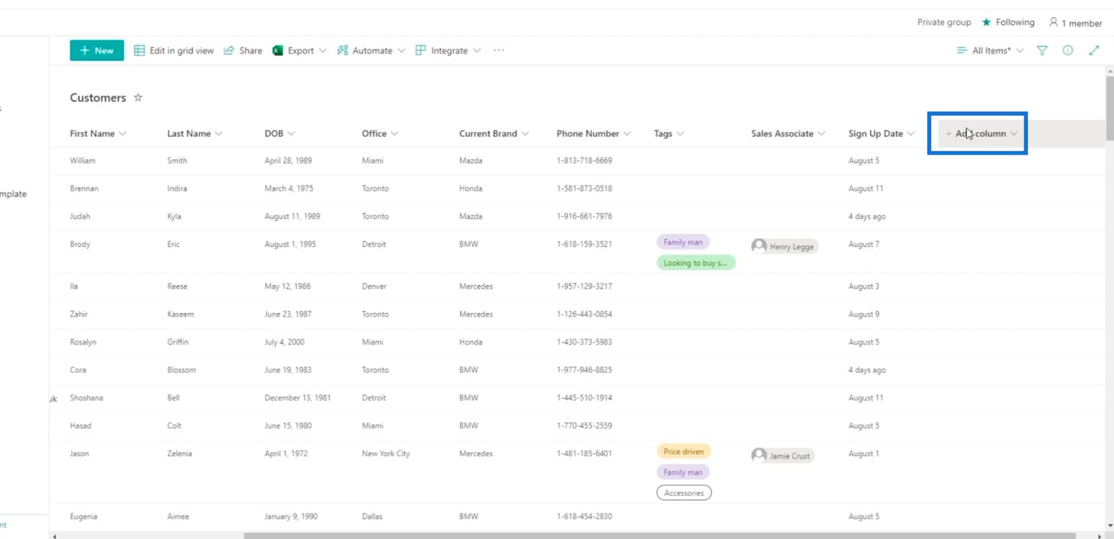 次に、SharePoint リストに戻り、[サインアップ日]列の一番上のセルを選択します。