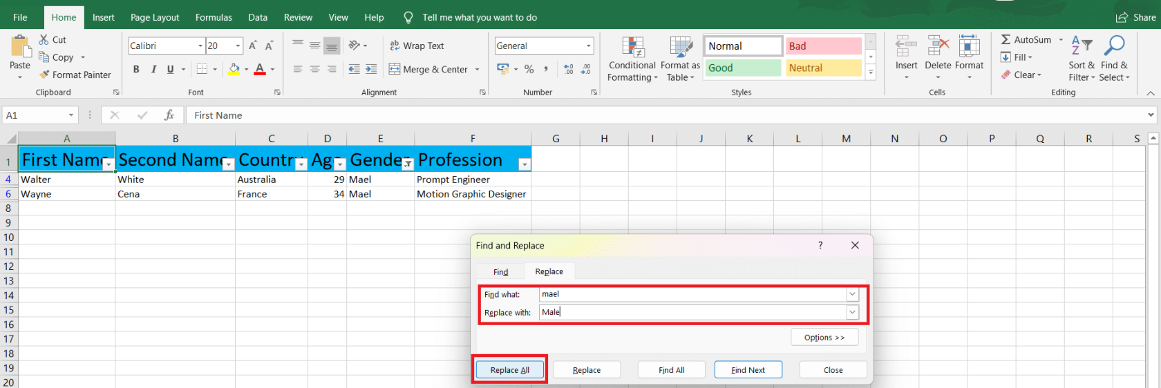5. Excel ワークシートには、間違った値が含まれる行のみが表示されるようになります。これらを修正するには、[ホーム]タブの[検索と選択]をクリックします。