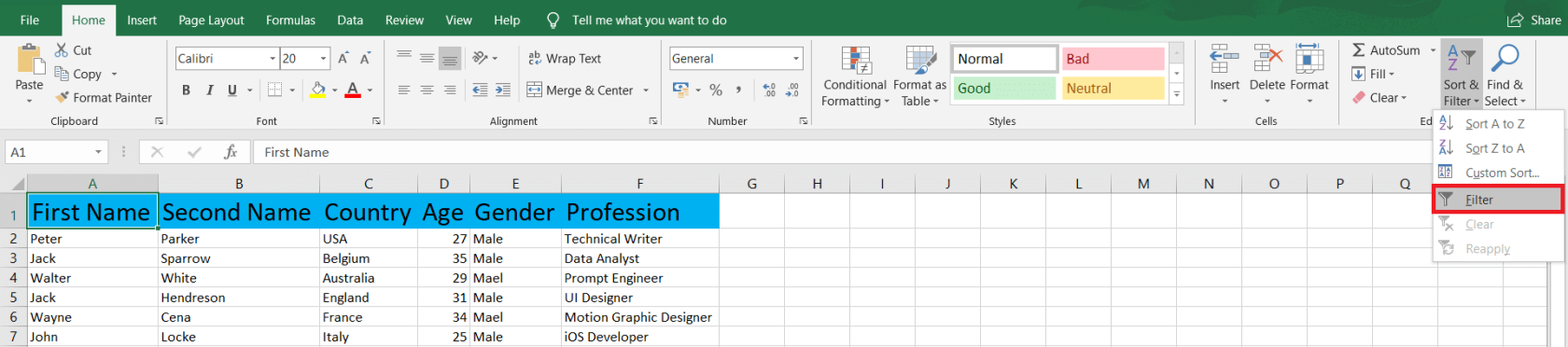 矛盾したデータを検出する最も簡単な方法の 1 つは、Excel のFilterを使用することです。