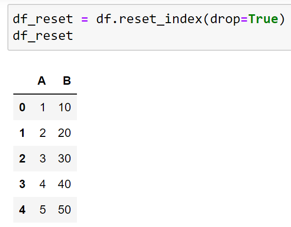drop=Trueを設定すると、現在のインデックス列が削除されます。一方、inplace=Trueを指定すると、新しいデータフレームを作成せずに、変更が DataFrame に直接適用されます。