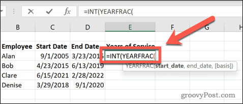 総勤続年数のみを知りたい場合は、YEARFRAC 関数を使用すると簡単に計算できます。この関数は、2 つの日付の差を年の端数として返します。これは一般的に、1 年間の給付のうち支払う必要がある部分などを計算するために使用されます。期間が 1 年よりも長い場合、小数点の前の値は、これら 2 つの日付の間の合計年数になります。INT 関数を使用して、この数値だけを返すことができます。