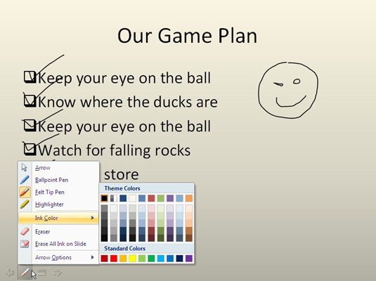 프레젠테이션 중 펜 혹은 형광펜을 사용하여 PowerPoint 슬라이드에 그린 경우, 사용자가 다음 프레젠테이션을 위해 그림을 저장하거나 쉽게 지울 수 있도록 하는 방법을 알립니다.