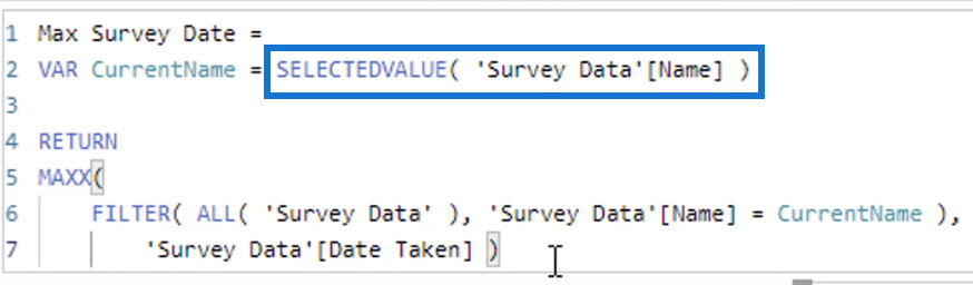 그런 다음 Survey Data의 Name이 CurrentName 변수와 같은지 확인해야 합니다 .