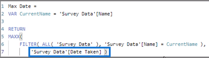 그런 다음 최대값을 평가해야 합니다. MAXX DAX 함수 는 최대값을 계산합니다. 따라서 수식에 열을 입력하기만 하면 됩니다.
