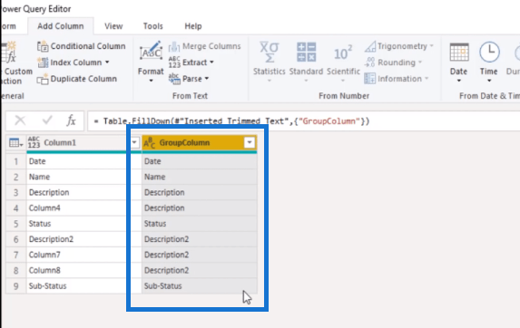 이 지원 쿼리를 참조할 수 있으며 나중에 이름을 바꾸겠습니다. 지금은 그대로 두겠습니다. 기억하시겠지만 우리는 두 개의 열을 병합하여 열 이름이 있는 하드 코딩된 목록을 만들었지 만 이제 GroupColumn 에서 Description을 필터링 할 수 있습니다 .