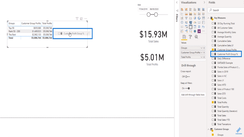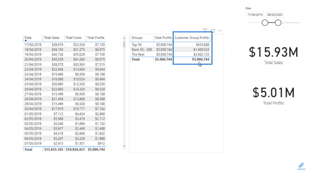 이러한 고급 DAX 기능을 사용하면 Customer Group Profits 열에 특정 고객 그룹의 총 수익을 표시할 수 있습니다.