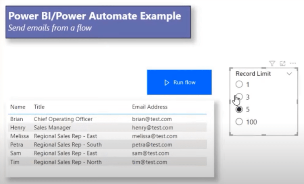 예를 들어 이메일을 보내려고 합니다. LuckyTemplates를 Power Automate에 연결하고 해당 작업을 수행하려는 레코드를 강조 표시할 수 있습니다. 버튼을 클릭하면 기본적으로 각 고객, 클라이언트 또는 팀 구성원을 위해 이메일을 보내거나 파일을 생성하는 Power Automate 스크립트가 트리거됩니다.
