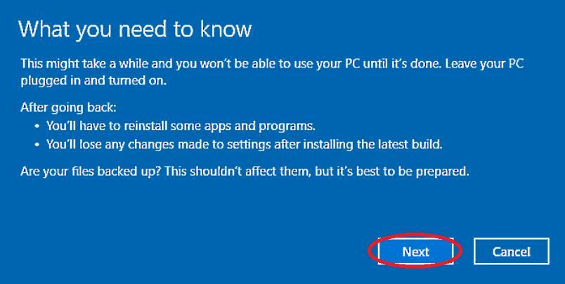- Теперь появится экран с инструкциями, которые вы должны выполнить после перехода на предыдущую версию. Нажмите Далее