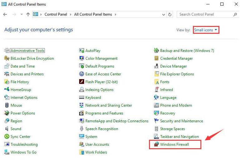- Нажмите кнопку « Пуск» > «Панель управления» . Выберите Просмотр по мелким значкам , а затем выберите Брандмауэр Windows .