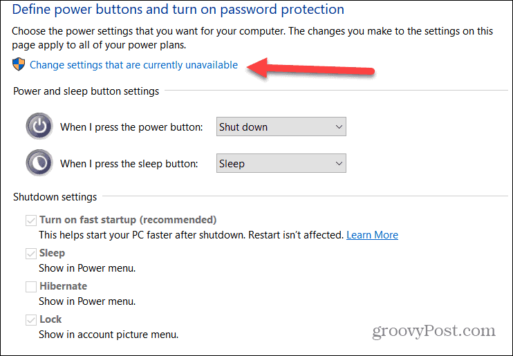 Далее вы увидите некоторые другие настройки выключения, а также настройки питания и кнопок. В разделе «Настройки выключения» вы должны увидеть список дополнительных параметров, таких как «Быстрый запуск», «Сон» и «Гибернация». Но все эти варианты, вероятно, неактивны. Чтобы сделать Hibernate доступным, нажмите ссылку « Изменить параметры, которые в данный момент недоступны » .