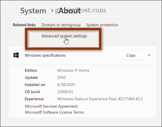 Откроется современное приложение «Настройки». Прокрутите вниз до раздела «Характеристики Windows» и нажмите ссылку «Дополнительные параметры системы» в верхней части раздела.