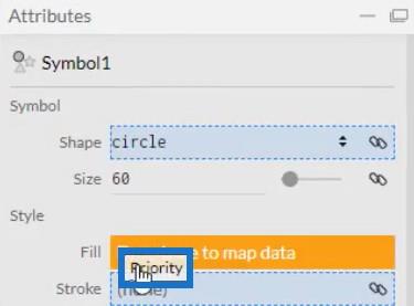 Затем поместите Priority в секцию Fill атрибутов Symbol1, чтобы добавить цвета к кругам. Цвета определяют статус приоритета категории, если она срочная или несрочная.