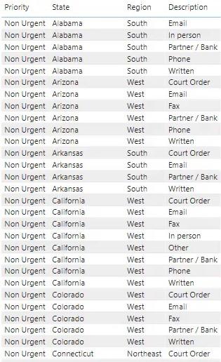 Вы можете проверить эти диаграммы в наборе данных в LuckyTemplates. Вы увидите, что количество срочных жалоб соответствует количеству красных кружков в каждом регионе.