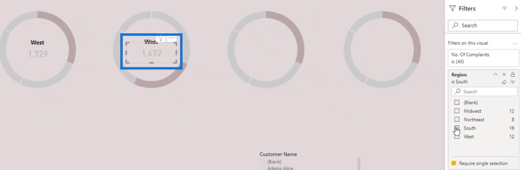 Дублируйте текстовое поле и карточку первой кольцевой диаграммы для второй диаграммы и выберите Юг на панели «Фильтр» .