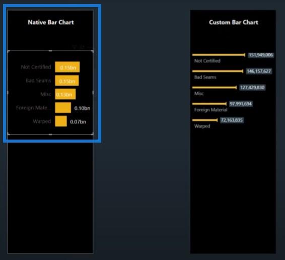 В этом примере у нас уже есть собственная линейчатая диаграмма из LuckyTemplates и пользовательская линейчатая диаграмма из Marketplace. Для третьего мы позже создадим гистограмму с помощью Charticulator .