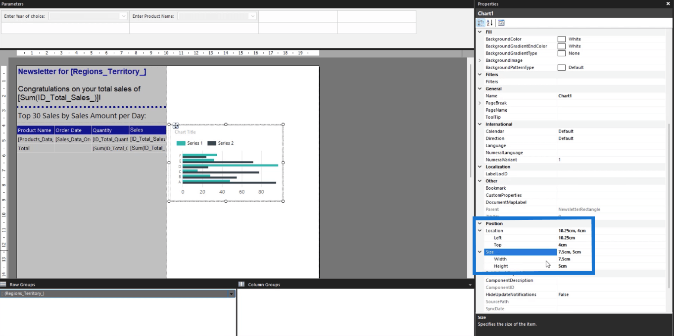 Когда столбчатая диаграмма появится в отчете, настройте ее размер, местоположение и положение. Вы можете сделать это вручную или с помощью панели свойств справа.