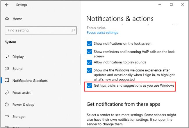 Снимите флажок Получать советы, подсказки и рекомендации при использовании Windows .