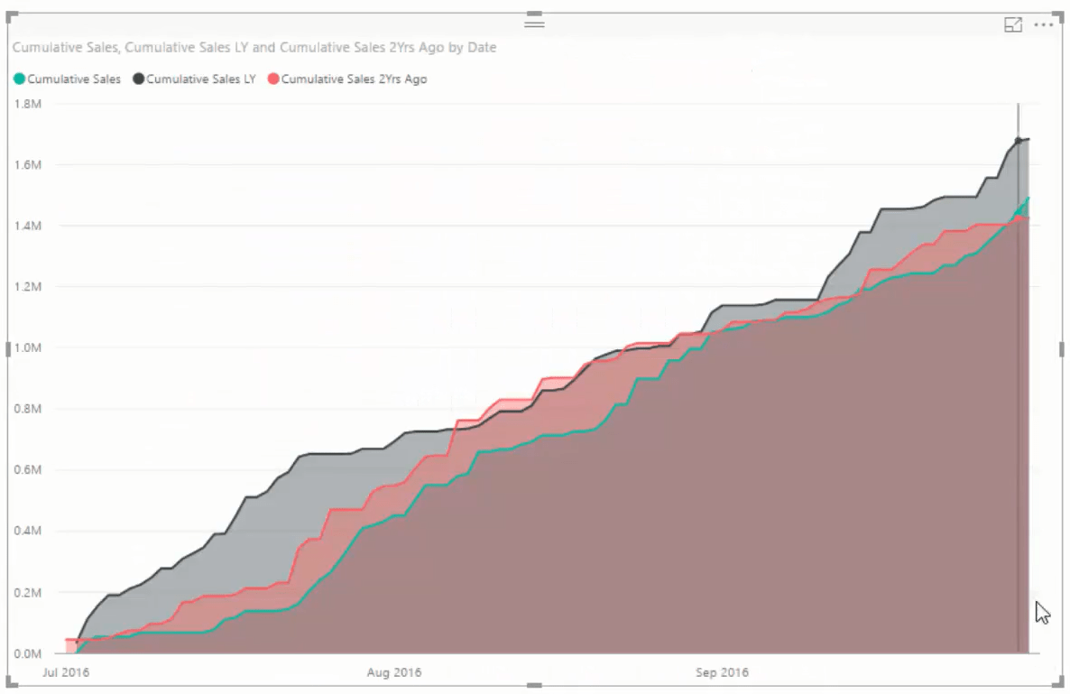 您獲得這種洞察力的速度之快令人難以置信。現在,您有今年、去年和 2 年前的累計銷售額。如果除去累計銷售額表之外的其他列並將其轉換為圖表,您將獲得令人驚嘆的可視化效果。