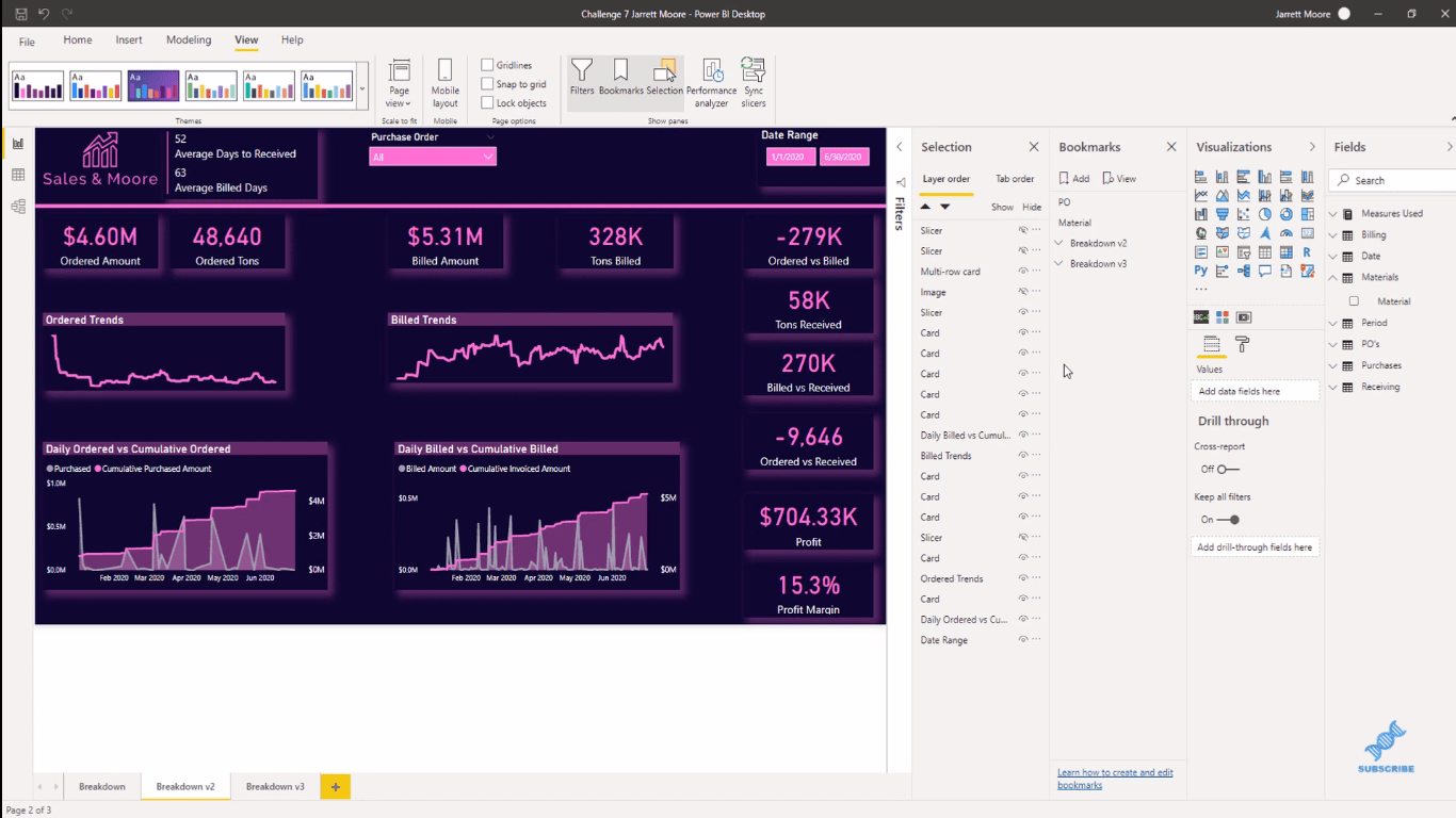 正如您在下面的報告中看到的,我有一個採購訂單過濾器和一個材料過濾器。然後我複制了這個頁面並將其命名為Breakdown v3(第三版)。它是相同的頁面和格式,但這就是我們要提出書籤然後相應地對它們進行分組的方式。
