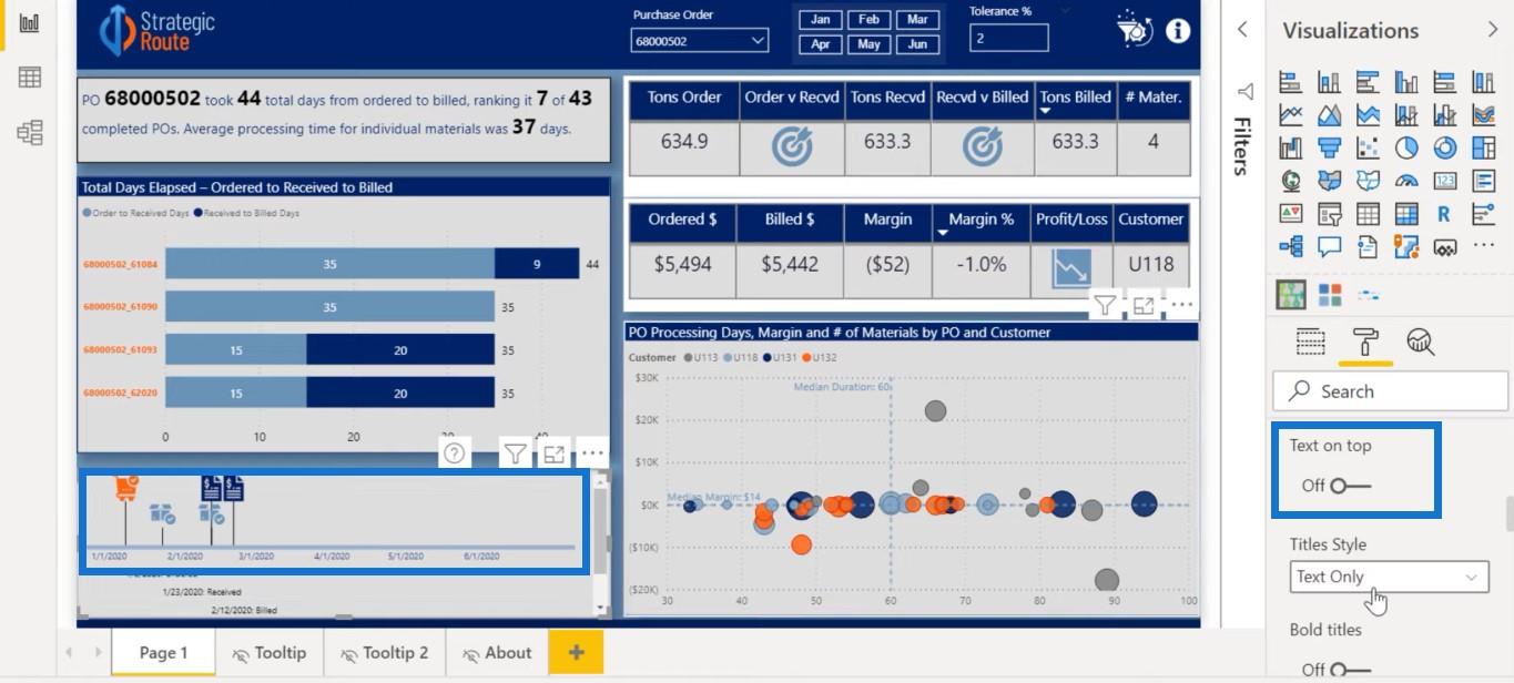 每個採購訂單都有多種具有不同交貨日期和不同發票日期的物料。一切都是完全動態的,所以如果您選擇另一個採購訂單,您可以看到視覺變化,您可以按材料過濾它。