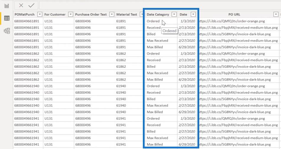 如果我們回到 unpivot 表,我們將看到單個 Date Column、Date Category以及採購訂單和模板的兩個URL 字段。