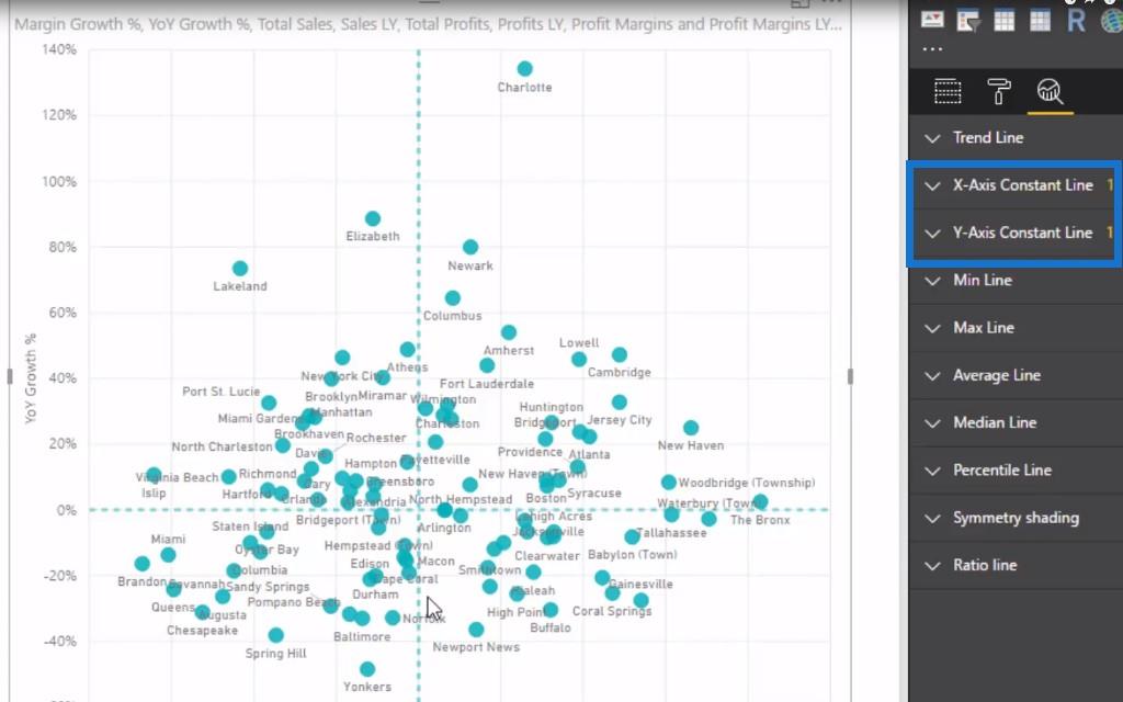 這就是分析功能真正發揮作用的地方。此分析功能對散點圖很有用,因為您可以在其中做很多事情。