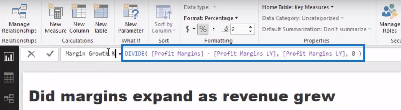現在,我們需要計算出我們的利潤增長,並執行與我們為銷售增長所經歷的完全相同的過程。我們的核心計算是利潤率,所以我們只需要去找出我們去年的利潤率。我把它放在CALCULATE函數中,並使用DATEADD函數跳回一年。
