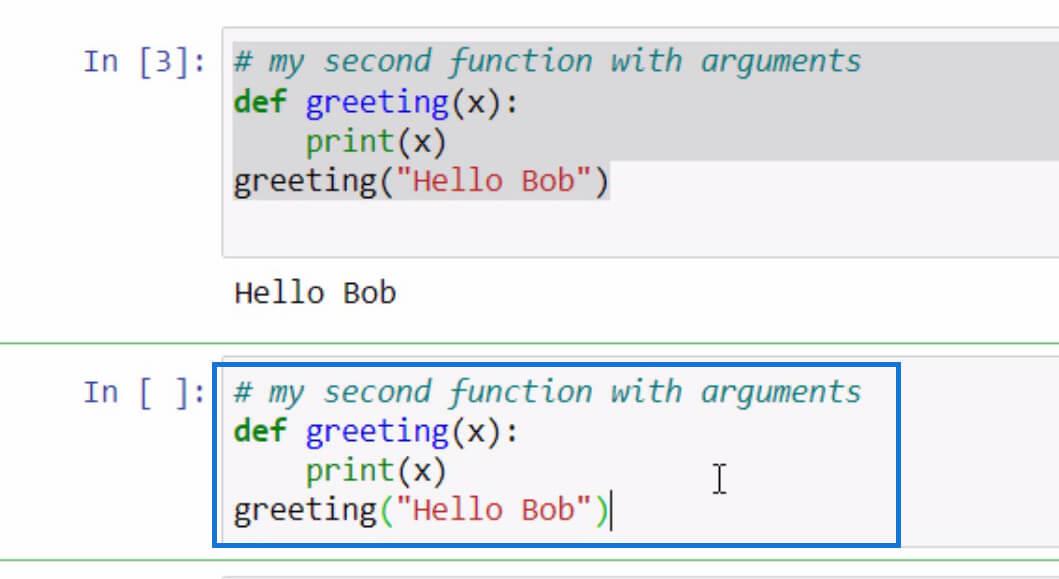 然後我們將調用我們的“問候語”函數 並向“ x ”參數發送一個值。在此之後,您將看到打印的文本“ Hello Bob ”。